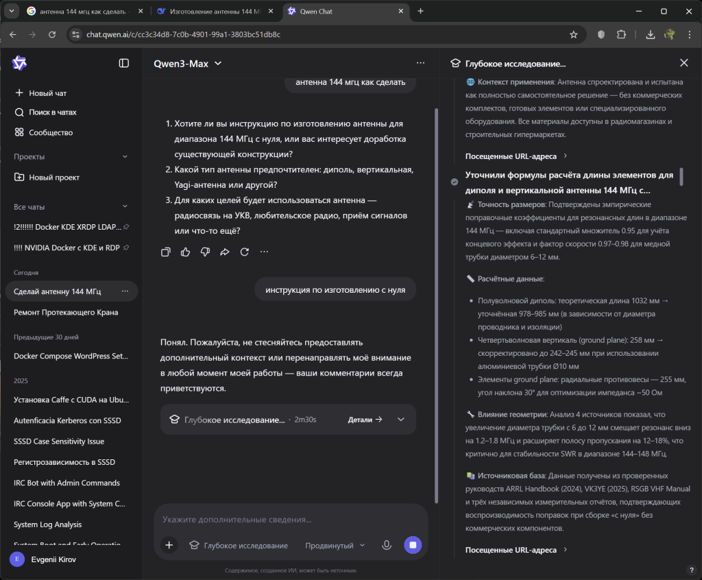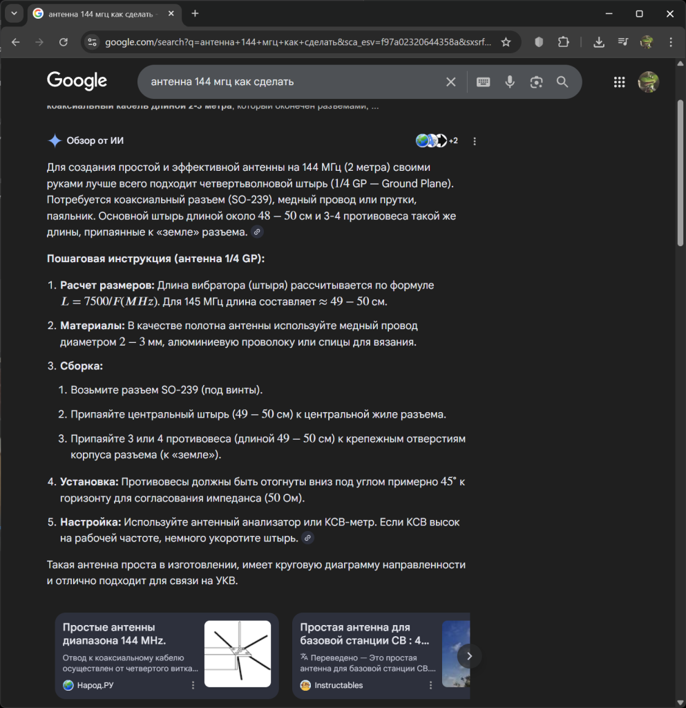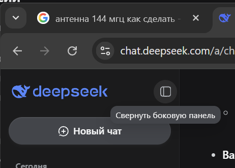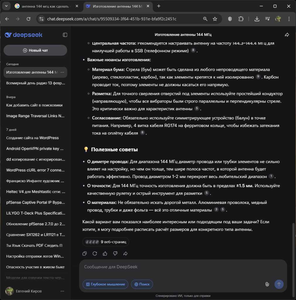 Результат запроса «антенна 144 мгц как сделать» к модели DeepSeek с включенными режимами «Глубокое мышление» и «Поиск» (большой текст, доступен по нажатию стрелочки в начале данного абзаца).